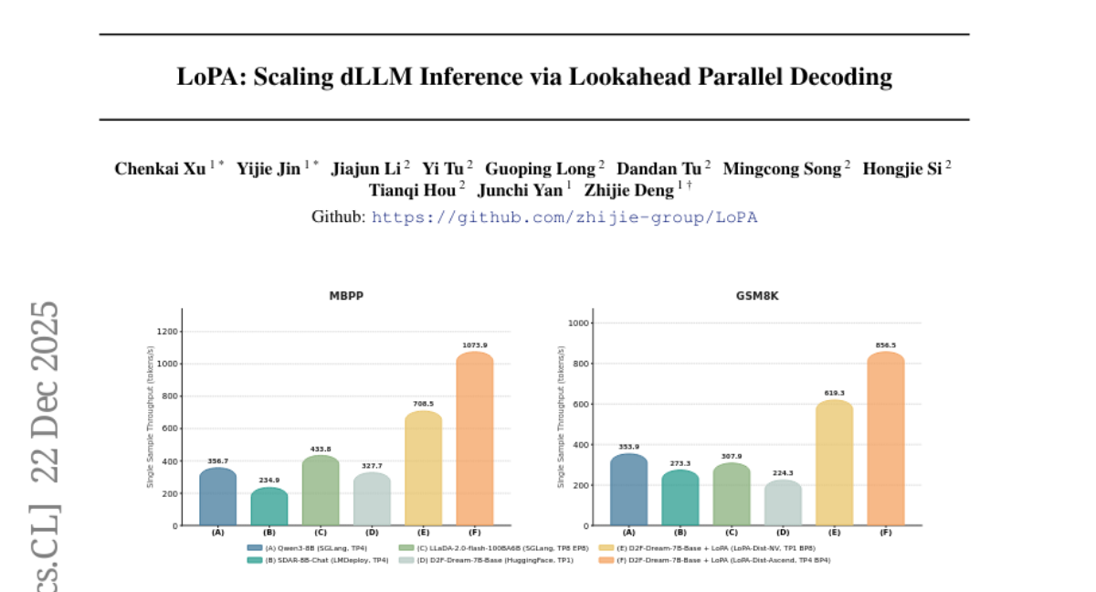 这项由上海交通大学严志杰教授领导,华为公司多名研究人员参与的研究发表于2025年12月,论文编号为arXiv:2512.16229v2。研究团队开发的技术叫做"LoPA"(Lookahead Parallel Decoding),简单来说就是"向前看的并行解码"技术。他们的方法成功让AI语言模型的推理速度提升了近10倍,在某些测试中达到了每秒生成1073个词汇的惊人速度。